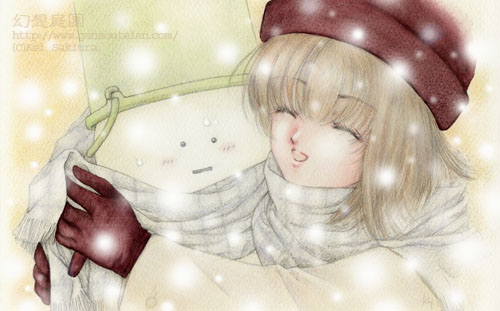 一部の女のコにモテモテのオリジナルキャラのゆきだるまくん・・・。そんな彼には、やっぱりかわいい女の子とのツーショットを・・・ということで、描いたイラスト。モノクロパージョンの方を12月に描きました(なので"初雪"なのです(^_^;))。今回、2月トップイラスト用にカラーバージョンを描き下ろしました(^_^)v。