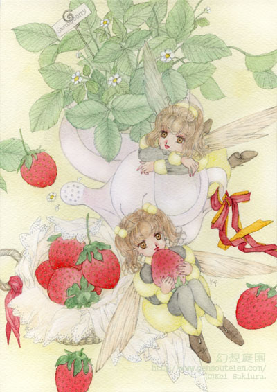 春らしく、みつばちちゃん'sと苺です(^_^)v。当初、みつばちの彼女たちの"ふわふわ"を、本当のミツバチの腹の様にシマシマにしようとしてたんですけど、咲麗にしてはめずらしく、ラフ絵に試し塗りしてみました。・・・が!!、きゃーー(>_<)これでは、まるで某カミナリ様(T_T)。ということで即却下。ほほほ(^_^;)。