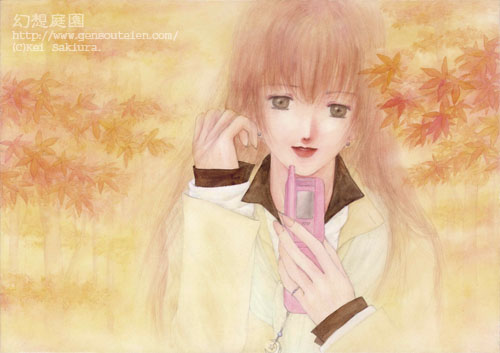 イラストの彼女はカメラ付き携帯を使用ですが、咲麗のは未だにカメラ付きじゃありません(昔買ったの・・・物持ちいいの(^_^)v)。コレを描くにあたって、「弱ったな〜資料が・・・。そうだ!カタログもらってこよう!」と、いうわけで、某大手家電量販店へ走り、携帯のカタログをいただいて参りました(^_^)v。・・・お店の方、買わないくせにすみませんでした(^_^;)\