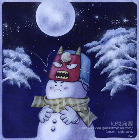 | ちょっと変則サイズのイラストです(^_^;)。節分のオニ役をけなげに務めるゆきだるまくん・・・。ちょっと前の作品ですが、他のシリーズにあわせてアップしてみました(^_^)v。 |