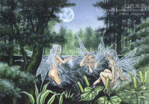 | 森の泉での水浴びシーン。咲麗がよく使うフレーズの”月華”とは”月の光の輝き・・・”という意味です。よく聞かれるの・・・(^_^;)。美しい月を表現したくて・・・画力足りないのを補足してみたり・・・(^_^;)v。タイトルは、言葉の雰囲気とか言葉のイメージで付けてしまっています・・・けっこう楽しんでます(^_^;)v。 |